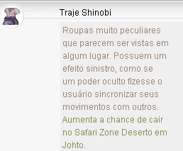 Alguns trajes tem efeito adicional nas zonas Safaris, por exemplo o Traje Shinobi, que aumenta suas chances de cair dentro da zona do deserto, onde se encontra o pseudo lendário: Larvitar