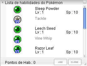 • O Pokémon pode usar habilidades próprias, que podem ser configuradas, No botão 'Skill' de seu Alt+R é possível visualizar suas habilidades.