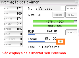• A janela mostra a Fome do Pokémon. É importante alimentá-lo na hora certa.
