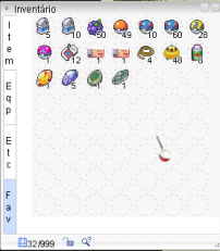 • Abre o inventário, onde você pode ver os itens que está carregando, como poções, itens, trajes, pokémons Divido em 4 abas, sendo elas: Item, Equipamentos, Etc e Favoritos
