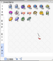 • Alt + E: Abre o inventário, onde você pode ver os itens que está carregando, como poções, itens, trajes, pokémons Divido em 4 abas, sendo elas: Item, Equipamentos, Etc e Favoritos
